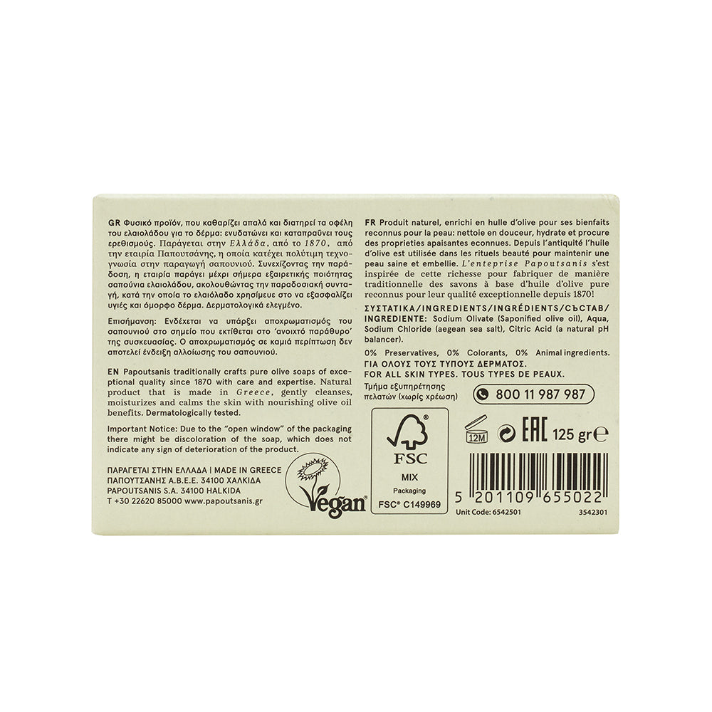 Sodium Olivate (Saponified olive oil), Aqua, Sodium Chloride (Aegean sea salt), Citric Acid (a natural PH balancer)